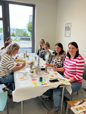 Am 23.9. fand das Elterncafé unter dem Motto „mein Hobby - meine Leidenschaft“ statt. Juliane Tosenberger stellte ihre Freizeitbeschäftigung vor und gab interessierten Mamas eine Einführung in das Aquarell malen und in das Handlettering (die Kunst einzelne Buchstaben, Wörter oder Sätze von Hand zu zeichnen und dekorativ zu gestalten). Die Kinder der Teilnehmerinnen wurden nebenan im Turnraum betreut und so konnten sich die Künstlerinnen ganz auf ihre Werke konzentrieren. Am Ende entstanden wunderschönen Karten.