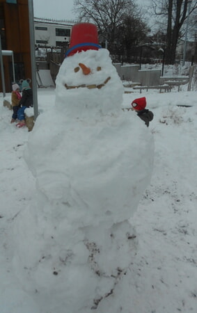 Die älteren Kinder bauten gemeinsam einen riesigen Schneemann. Hierfür benötigten wir sogar die Hilfe von einem Papa, der uns half den schweren Kopf aufzusetzen.